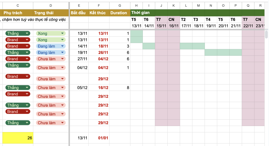 Sẽ chia thành timeline dự kiến và timeline thực tế, nhằm dễ so sánh và đối chiếu về sau.