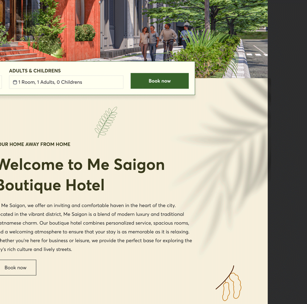 Sau khi khảo sát về thông điệp muốn truyền tải đến khách hàng của Me Hotel là bảo vệ môi trường và biểu tượng cây me của brand. Mình đã định hướng cho màu sắc chủ đạo, hình ảnh cũng như phong cách của web.